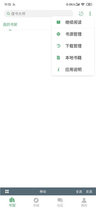 1、启动搜书大师,在书源管理页面点击右上角三点菜单