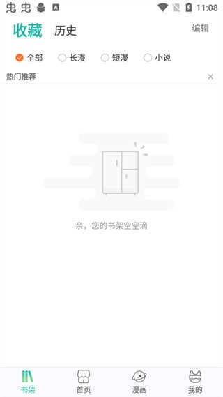 3、书架页面将展示你收藏的所有长篇漫画、短篇作品以及小说资源;