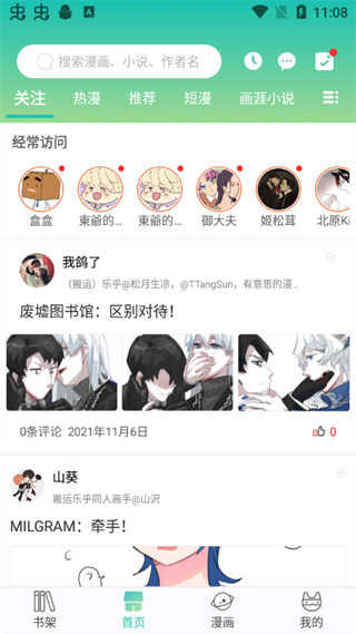 4、首页界面可查看关注漫画的更新动态,并会智能推荐新作品;
