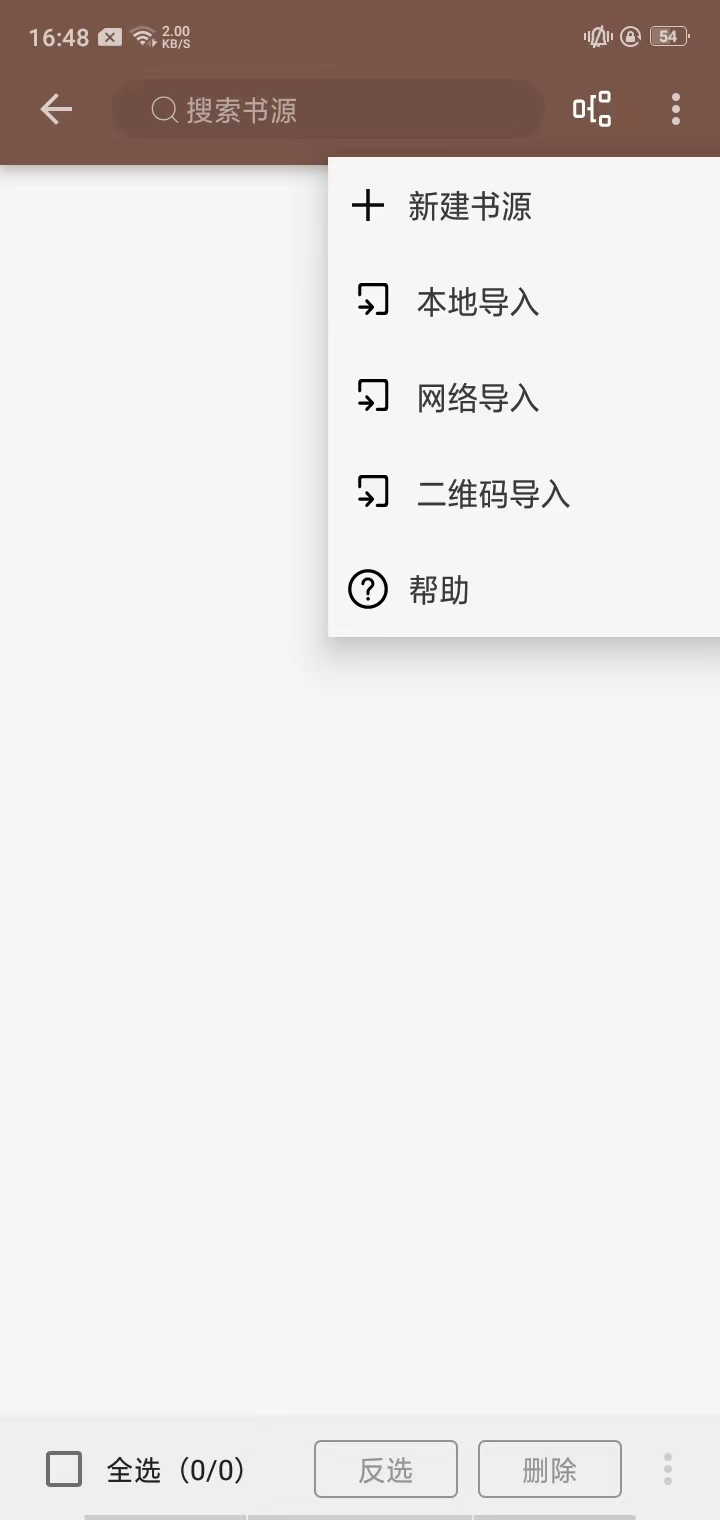 2、点击右上角的三个点,在这里可以新建书源,也可以选择本地导入、网络导入或二维码导入,用户可根据自身需求选择合适方式;