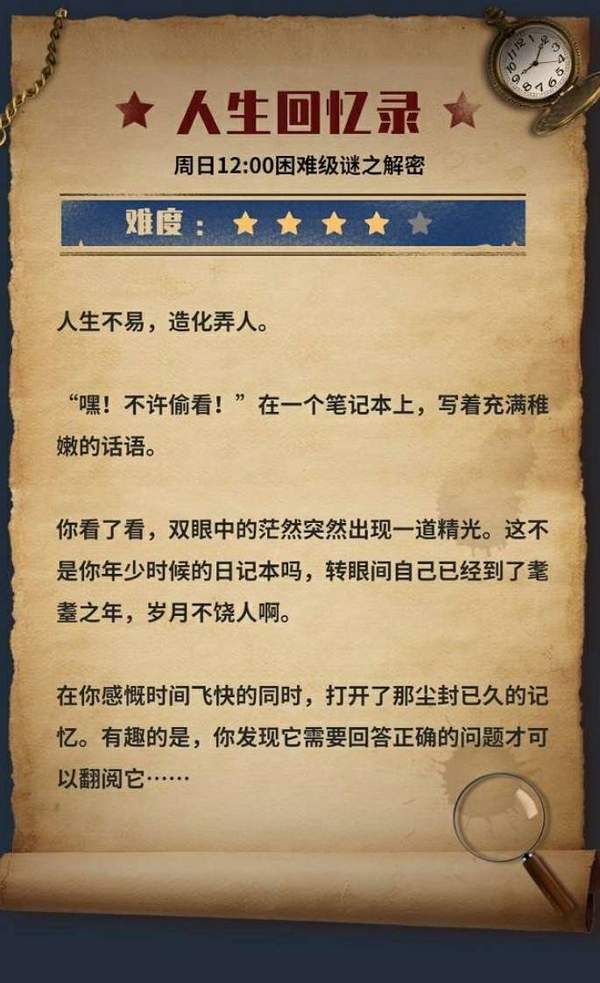 犯罪大师侦探社区更新了周日十二点的全新谜题预告,人生回忆录是困难级别的解谜!