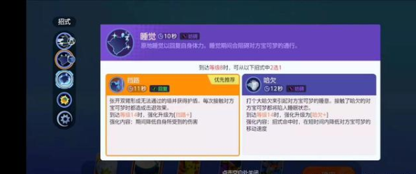 卡比兽二技能:睡觉:原地睡觉回复体力,睡觉期间阻碍对方宝可梦通行。