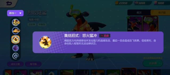 烈咬陆鲨集结招式:怒火猛冲:朝面前方向持续移动并发动强力的连续攻击,最后一击会造成击飞效果。