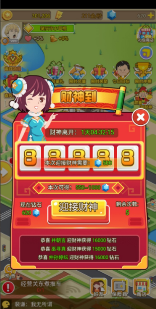4.点击迎财神,可以抽钻石(纯属看个人运气)
