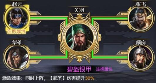 首先要推荐的第一个组合就是我们的赵云和关羽了,两位作为三国的风云人物。实力肯定是毋庸置疑的!本身关羽就是拥有着高额输出的一个武将,在加上赵云就可以额外出发隐藏的宿命效果。武圣:当关羽和赵云同时上阵的时候 武圣的伤害会提高30%。所以说,前期招到赵云就可以和关羽以后就可以一起驰骋沙场了,无论是属性还是合击技都非常实用
