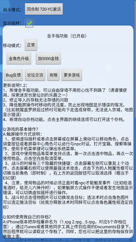 1,触屏和虚拟摇杆两种操作方式可以选择.游戏菜单和战斗支持点选,操作更加方便.