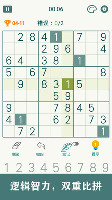标准数独:经典九宫模式,1~9的数字在九宫的“行”、“列”、“宫”中只出现一次,烧脑的数学游戏,让你成为数学王国的数字英才。