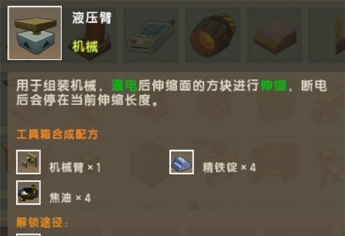 获得方法:消耗10个液压臂碎片解锁,在工具箱消耗4个焦油,4个精铁锭,1个机械臂进行合成