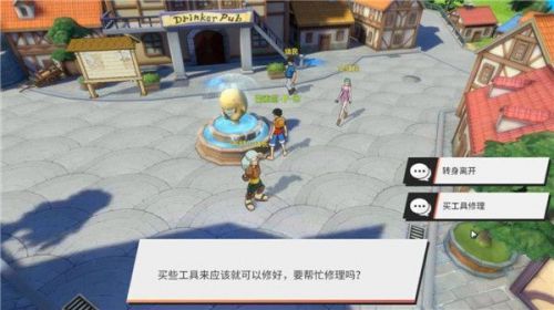 紧接着游戏会提示玩家“喷泉有些怪怪的,似乎是一个出水口损坏”,并询问玩家是否要对其进行修复。这里选择“修复”会消耗玩家在游戏中的代币“1000贝里”来购买工具,而在修复好喷泉之后,则会收到“高级召唤券碎片X3”的奖励。