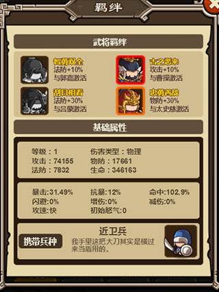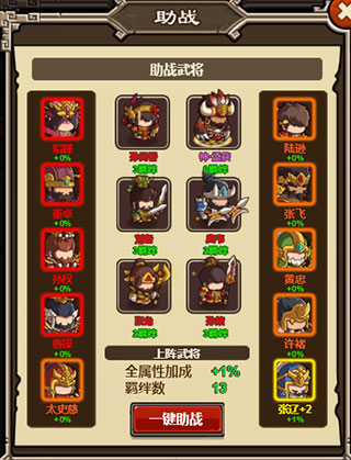 羁绊武将在阵容中或者在助战即可触发,黄品质一样的武将升阶后会提升助战全全属性加成,合理的搭配会让你更快速的过关。
