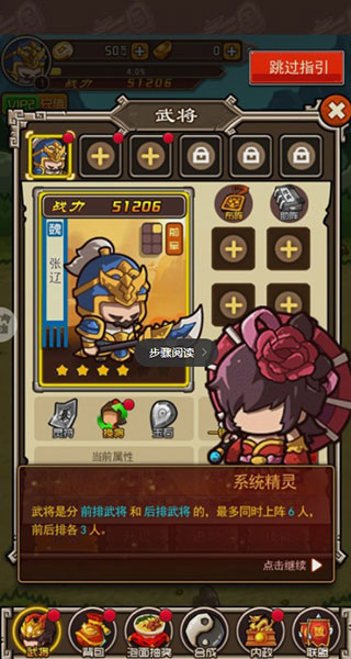 武将有前后排之分,前后排分别最多上3人(总共6人),相对属性特点比较明显前排多为防御属,后排为输出或辅助,所以获得一个新的武将时来看看他的属性特性方便你对阵型的搭配。