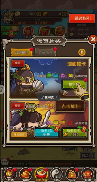 1、游戏的首要步骤是抽卡,英雄的获取是提高我们战斗力的基础,也就是底部第三个“泡面抽奖”。