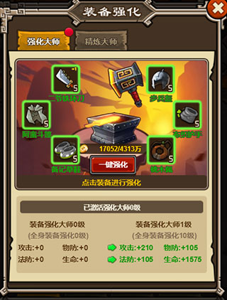 每个武将可佩戴6件固定类型的装备(具体累心一看就明白了),培养装备的套路基本和武将的套路一样,不同的就是,强化大师和精炼大师这个是按照一身装备的最低等级判定的,目的就是叫你别都砸一件装备。