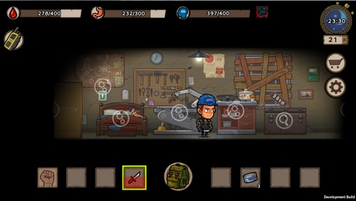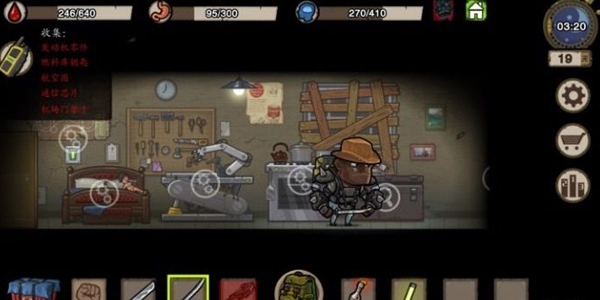 除了搜集,我们还可以靠击杀僵尸来获取材料,打死一只僵尸都能在他们身上搜出不少有用的材料。然而游戏里的装备可是坏得飞快:一根木棍打上差不多10个僵尸就断了,大部分时候只能抡拳头。系统的补给包给的一把小手枪,没有一发子弹。我们要给手枪做子弹、给弩箭做箭矢需要材料,无论你要做什么都需要材料和资源,当你天真的以为随便都能找到资源的时候,你就会发现你根本看不到明天的太阳。材料的匮乏与饥饿与精力的下降无时无刻的强烈困扰着你。材料不够、药品不够、食物不够,而僵尸又多又强。尽管不同形态的僵尸可以利用他们不同的移动速度来各个击破。但是你还是一个困在末日中“可怜的人类”,这一切都不是看似那么简单的!