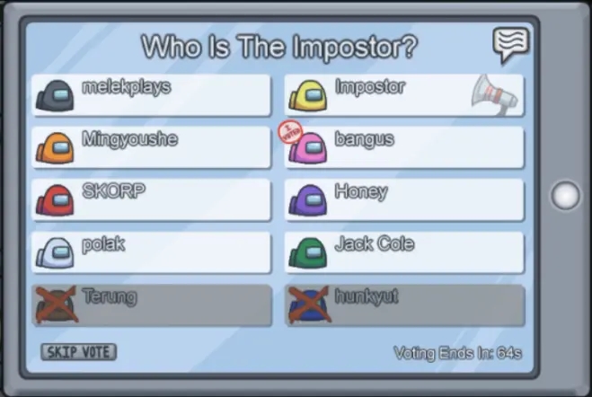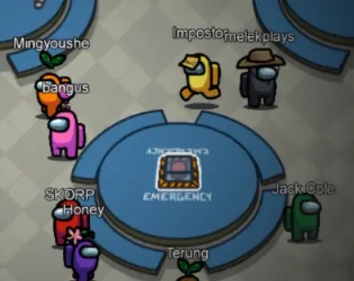4、发现尸体或按下紧急按钮后可召开会议,经过讨论后投票淘汰一人