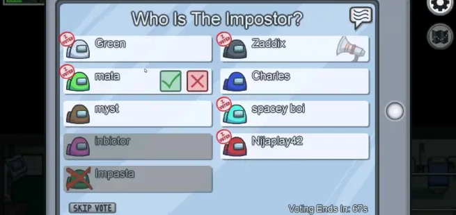 在博弈过程中,任何人都有一次或两次使用紧急摁钮(大厅出生点)的机会来进行投票,说服大家投给那些你怀疑的人。