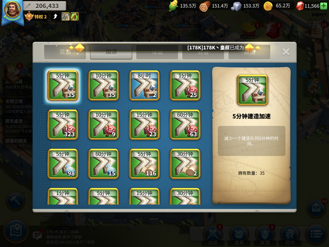 但是选择文明不单单是看玩家自己,同时也得根据当前服务器宏观发展的层面来决定,就拿我现在所处的服务器来说吧,这个服务器也算是开服挺长时间的。刚进入的玩家,只要跟着各种活动以及任务做一段时间,就会积累非常大量的建造加速。对于一些玩家来讲,可能会舍不得用这些加速,但是我的建议是根本不要去吝啬使用它们。在老服务器中,各种各样的活动都在狂送加速,为的是极力推动新加入的玩家快速发展从而跟上其他玩家的步伐,毕竟作为一款已经公测近一年的手游,而且还是这种偏养成的SLG游戏,新老玩家间不均衡的游戏时间往往会成为一种障碍。