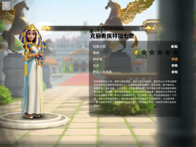 而多文明的选择也成为了《万国觉醒》宣发的一个重点,针对不同的文明会有许多一般玩家不了解的历史知识。我们在游戏中所获得的统帅每个都有一段详细的历史介绍,比如埃及艳后克丽奥佩特拉七世,我们通过游戏知道她除了有美艳动人的外貌以外,还具有极强的政治实力,通过斡旋于凯撒与安东尼之间,使得弱小的埃及一度保持了多年的和平甚至差点让罗马成为了埃及的一个行省。直到公元前30年,屋大维进攻埃及,克里奥佩特自杀身亡,古埃及文明最终走向灭亡。
