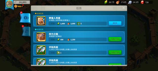 想要快速获取资源,首先是游戏中的主线任务,玩家是一定不能错过的,完成难度也很低,完成对应的任务后都会有丰富的奖励,一般情况下奖励最多的就是食物、木材等。