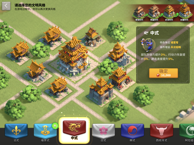 目前来讲,玩家刚进入游戏有两个文明,选择是比较多的一个是中式一个是德式。选择中国文明的原因除了本身作为中国玩家对于文明的固有情感外,还有一个重要原因就是中式文明能够提升5%的建造速度,这在一些之前有一定SLG手游基础的新玩家看来是非常有用的加成。与此同时,部队防御力提升3%也让一些平民玩家在野外遭遇敌方势力的袭击时有更多的脱离机会。