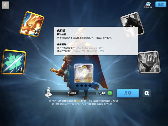 曹操的被动技能虎豹骑能够让骑兵的行军速度提升3%,满级后提升10%。而本身的主动技能还能够减少敌方10%的移动速度,因此在交战时利用游击战术能获得比较高的收益,甚至在打团战的过程中,配合德式文明的加成一波快速的爆发还有机会偷掉地方的输出部队。