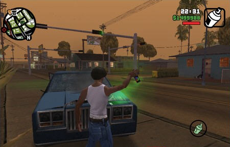 这一次要和Sweet一起到街道上涂鸦,拿到喷罐后上车朝Idlewood的方向驶去。下车后切换喷罐到手上(E),对着墙上标志按鼠标左键,直到图案完成,注意涂鸦时要避开警车和警察。要涂鸦的位置地图上用深绿方块标注位置,开始Sweet涂了一个,有两个在街道对面,一个在屋子前,另一个在院子后围墙上。完成后上车赶往下一地点,这里街道墙上有一个,附近的围栏里有两名混混,用喷罐制服他们后将附近的标志喷涂上。最后一个在屋顶,先翻过(Shift)两道栅栏,由石墩爬上屋顶找到位置,完成后跳上Sweet的车回家。