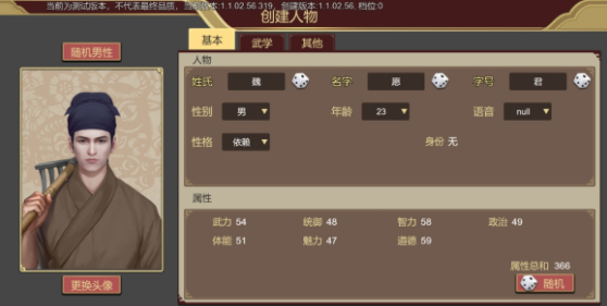 也可以前往左下角的“创建人物”,自创一个新角色。外观、主要属性、自带武学、其他能力都需要手动点击随机生成,手气好的roll出一个根骨极佳的初始人物也不是不可能~