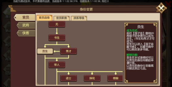 以查看级别职务为例,不同的身份对应不同的分支。随着游戏进程完成任务满足升级条件,提升自身的品级、职务或派系等级,解锁更多的功能。老爷们选好目标方向埋头修炼吧~