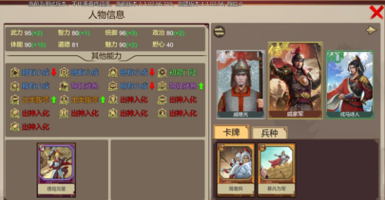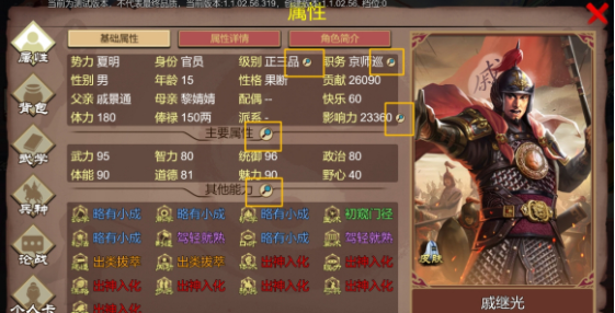 点击界面左上角的头像,这里集合了人物属性、背包物品、调整武学、解锁兵种、书籍装配、个人卡等界面。想要了解更详细的信息,可以点击文字旁边的放大镜图标。人物本身主要分为主要属性以及其他能力,游戏内都有详细的文本说明。