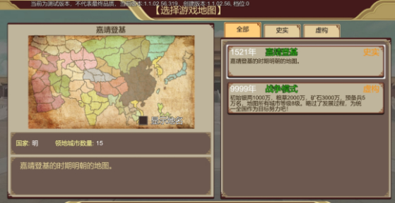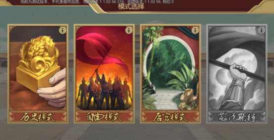 进入历史模式,玩家可以选择不同的朝代进行游戏体验,从目前的内容来看,制作组优先开放出了明朝的历史内容,拖动模式选择会发现其他朝代也在制作中,后续应该会有更多的朝代可供选择。