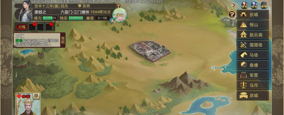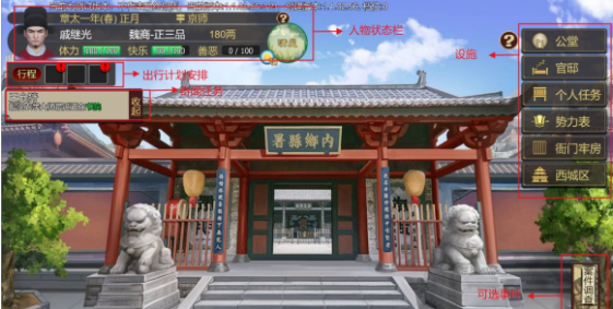 行程界面包括出行行程(搬家、前往其他城市),赛事行程(马驹比赛、诗文大赛),其他行程(亲自练兵、完成任务)。设定好行程后,将在次月份生效前往目的地并消耗体力。