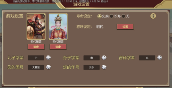 主要是一些外观、寿命、自定义输入称呼、代号等等相关设置。人物寿命可以设定为历史真实参照、增加20年或不会随年龄增加减少寿命。