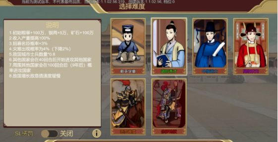 根据喜好选择好身份,包括皇帝、知府、巡抚、赋闲(可进阶为侠客和书生)。