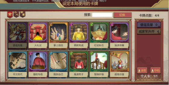 根据本局游戏的玩法决策,提前搭配好【个人卡】和【专属卡】的组合,要注意不能超过点数上限。点击左边的卡牌即可添加至本局游戏中,还支持配装存档方便老爷再次选择。