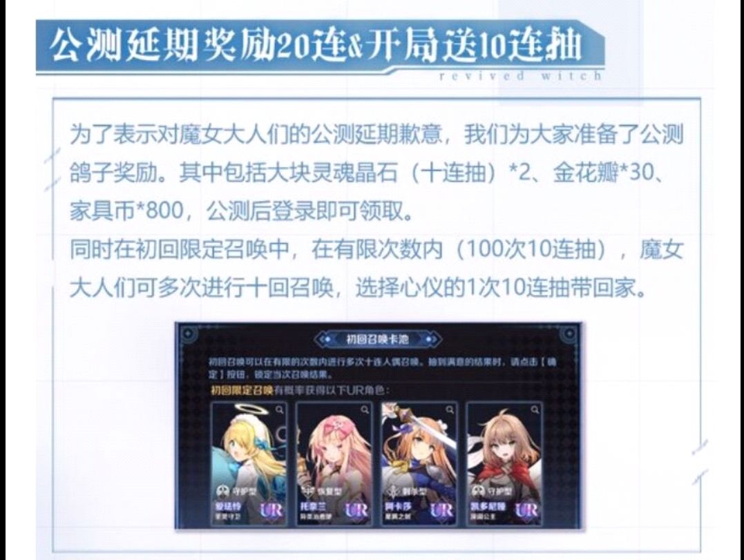 对于游戏延期给魔女大人游玩带来影响,我们将增加如下补偿:
