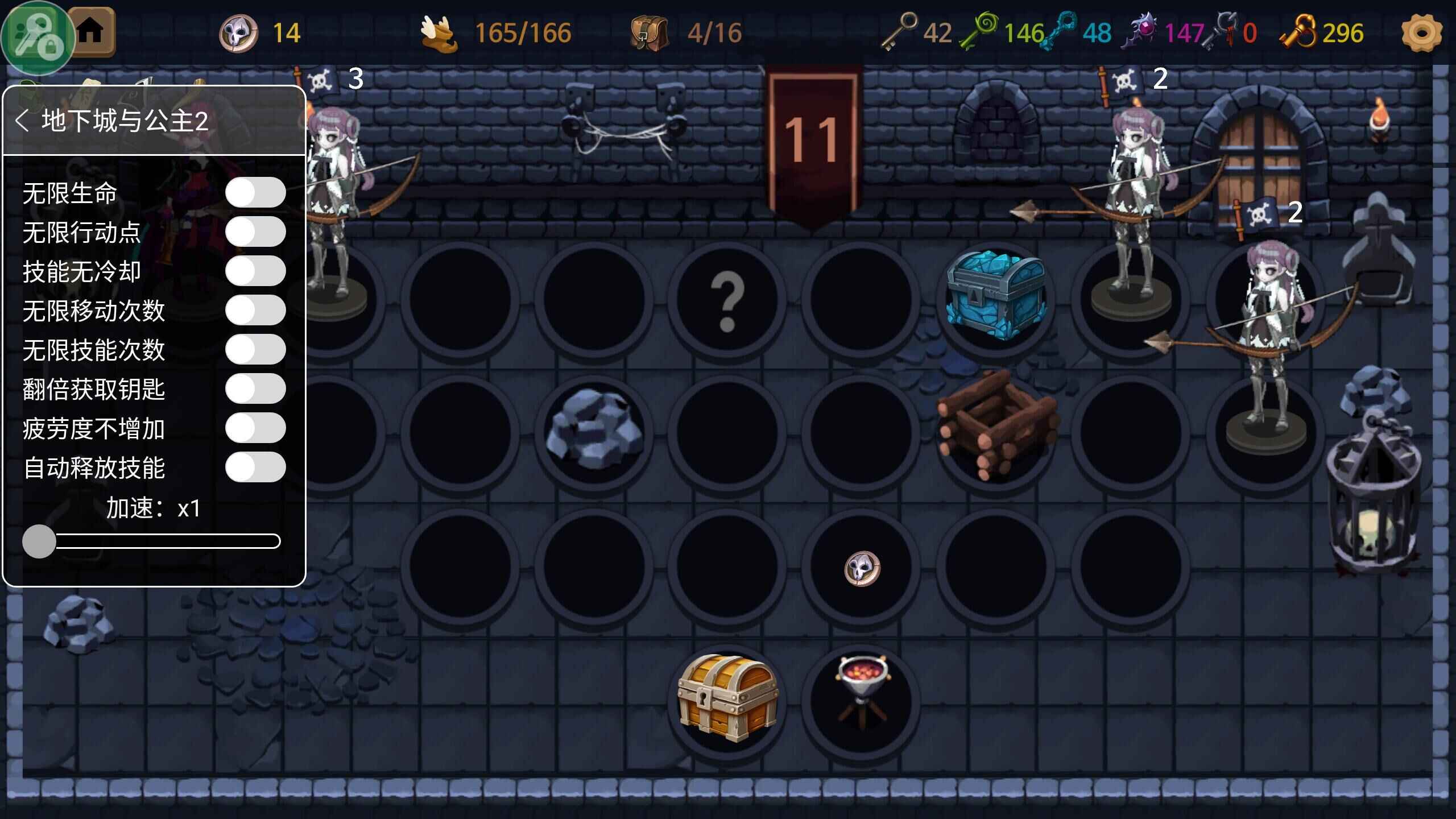 无限生命,无限行动点,技能无冷却,无限移动次数,无限技能次数,翻倍获取钥匙,疲劳度不增加,自动释放技能(需点击英雄),游戏加速