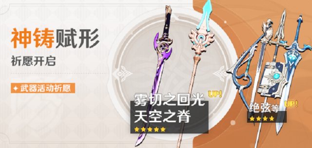 而神里的武器从池就显得没有那么良心了,武器池的具体详情为五星武器为雾切之回光和“痛苦枪”天空之脊,四星武器为绝弦、西风剑、枪、法器和祭礼大剑。四星不用多说,西风日常来脏池子,不过五星武器就太毒了吧。雾切之回光这把武器,想必有不少小伙伴们也都差不多知道了它的属性是多么棒了,几乎给任何一个单手剑角色都非常实用。