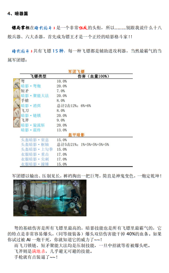 答:武器负责武器伤害,头盔负责头部防御和暗影技能伤害,甲负责身体防御和体术伤害,飞镖负责飞镖伤害,在同战力下的所有头盔和甲的防御力、暗影技能伤害和体术伤害均不同。