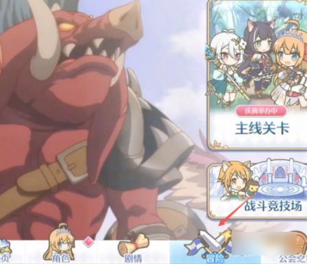 首先就是进入到公主连结游戏中,点击下方的冒险。