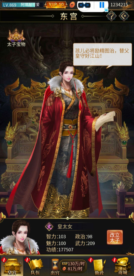 甲级+1点纯废物,直接合成高级书。皇帝爵位后解锁东宫玩法,立皇太子的选择跟书籍赏赐的原则一致。