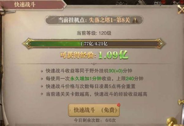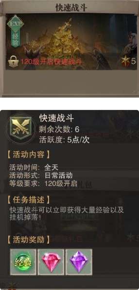 3、快速战斗,字面意思可获得挂机XX分钟的收益,包括经验和挂机掉落。