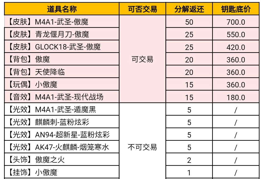 为了让大家进一步了解到这些道具的价格,我把它们的分解返还钥匙数量,以及交易底价都放在了下表中,请各位自行参考。
