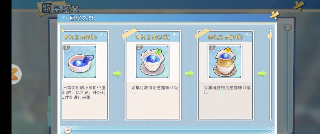 采集方法:双击回忆之泉、虹之花,就可看到修复进度。