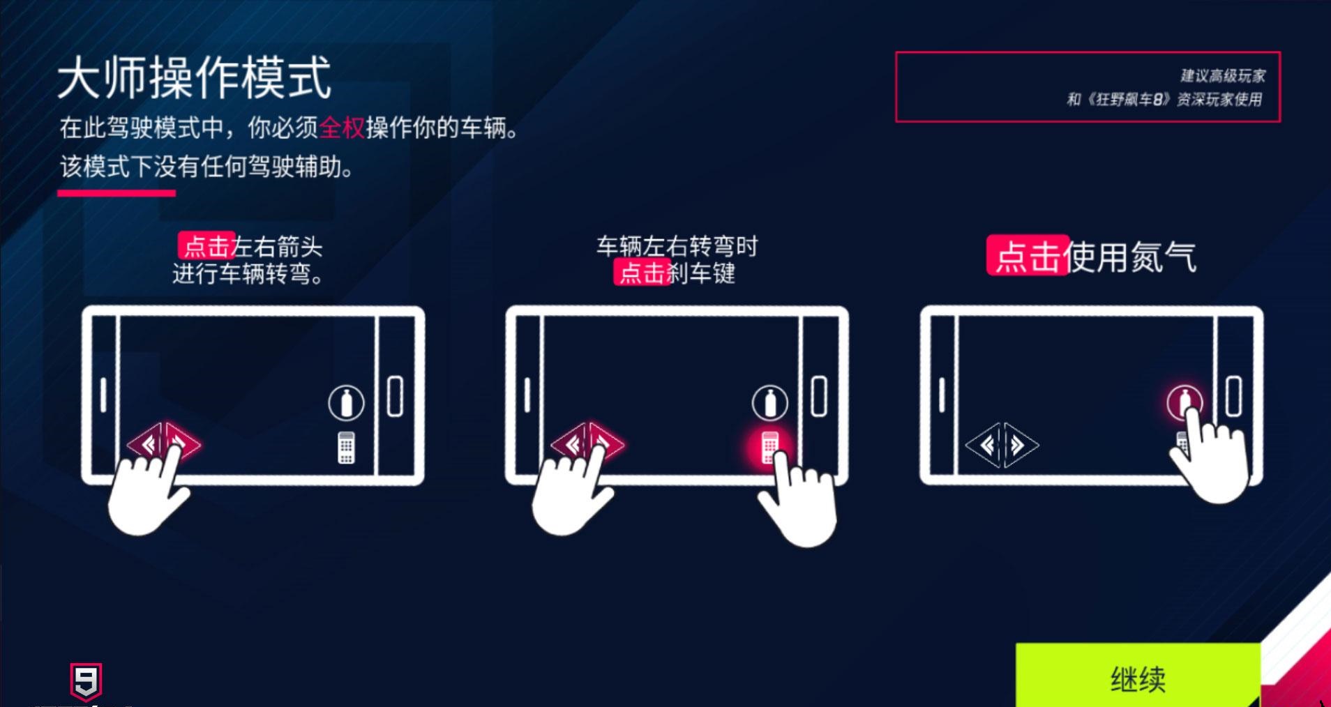 大师操作模式也就是所谓的重力感应,什么是个重力感应,听起来很高大上的样子,其实就是利用手机重力感应系统来控制方向,摆动手机两端就行。注意左右摇晃手机时点击刹车进行漂移,还有别太用力了,小心手机会甩出去哟。