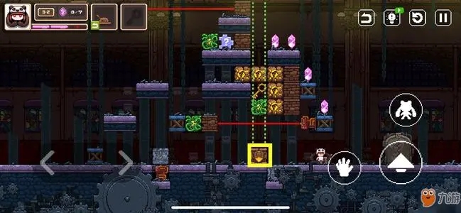 就像前面说的,这是一款像素风格的横板跳跃游戏,游戏本身的操作并不复杂。玩家通过左边的左右移动键移动小女孩,使用右边的操作界面来跳跃、推箱子,没错推箱子这个系统正是游戏的核心,在游戏过程中,玩家需要通过推箱子的方式来躲避激光的伤害,触发各种可以互动的场景机关。