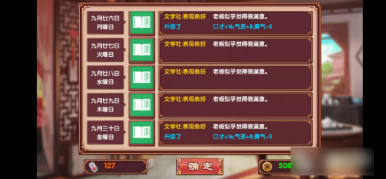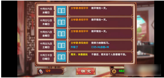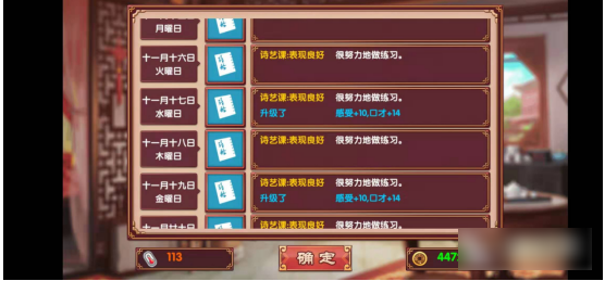 2、文学课:该课程同样一次可以提供14点口才属性,还能增加10点自信。口才加成一样,但具体选择哪一课程,还是根据玩家们的攻略方向而定。课程会统一在12岁时的四月份开启(游戏的第四回合),初始消耗费用都是一节课15金钱,随着等级的提升后有可能会增加支出。