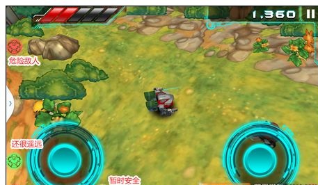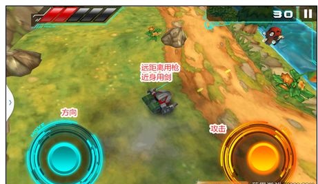 游戏基本操作很简单,左下角的摇杆控制角色方向,右下角的摇杆用来攻击敌人。距离比较远的敌人,机器人会自己用枪攻击;而对于近身的敌人,机器人则会拔出佩剑将其击杀。