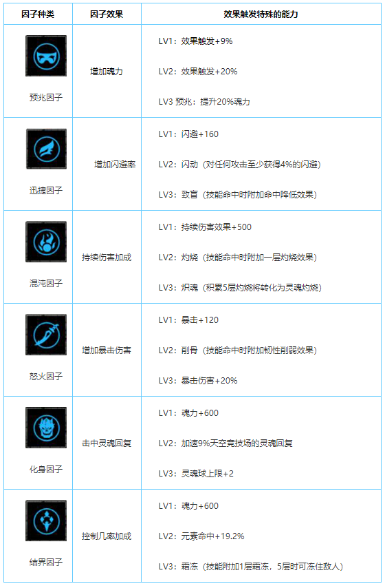 魂之幻影中每个人有三种面具,但一次只能佩戴一个,面具分为魂、幻、影三种类型。每种面具都带有魂力属性,其中三种面具都分别带有各自独有的属性,魂为混沌,幻为预兆,影为化身。穿上面具将激活角色的元素伤害能力,装备面具同时会赋予暗影潜能。暗影潜能将使角色朝着不同的方向发展,提升暗影潜能的因子等级就能够提升暗影潜能的效果,并且当因子达到5,15,30时会激活特殊的能力,下面我们来看看都有哪些特殊的能力吧。