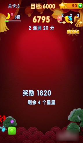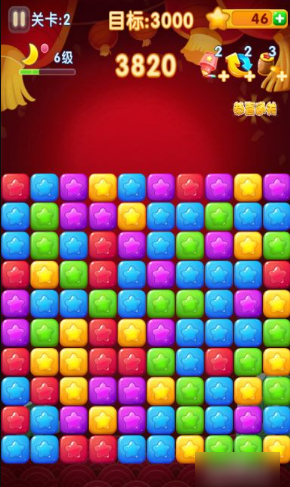 2、*关的通过分数是1000分,但是在*关需要赚取3000分,才可以笑到最后,把基础打好。首先,在消除星星的时候先看一看是否有多个连接在一起的,有的时候,自己找不到消除那个星星,系统会给个提示。