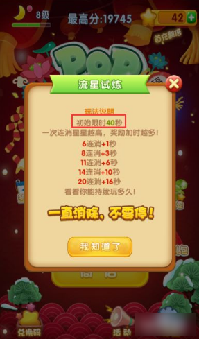 5、第二种模式:流星试炼。刚开始的时候,有40秒的基础时间,如果自己在消除星星的过程中,能够进行6连消能够加一秒钟的时间,往上越来越多,这个地方是考验眼疾手快的地方。